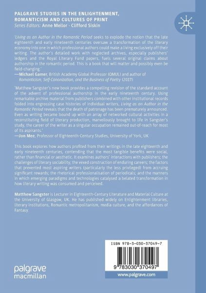 This book explores how authors profited from their writings in the late eighteenth and early nineteenth centuries, contending that the most tangible benefits were social, rather than financial or aesthetic. It examines authors' interactions with publishers; the challenges of literary sociability; the vexed construction of enduring careers; the factors that prevented most aspiring writers (particularly the less privileged) from accruing significant rewards; the rhetorical professionalisation of periodicals; and the manners in which emerging paradigms and technologies catalysed a belated transformation in how literary writing was consumed and perceived.