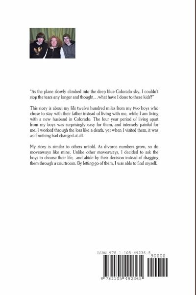 "As the plane slowly climbed into the deep blue Colorado sky, I couldn't stop the tears any longer and thought...what have I done to these kids?" This story is about my life twelve hundred miles from my two boys who chose to stay with their father instead of living with me, while I am living with a new husband in Colorado. The four year period of living apart from my boys was surprisingly easy for them, and intensely painful for me. I worked through the loss like a death, yet when I visited them, it was as if nothing had changed at all. My story is similar to others untold. As divorce numbers grow, so do moveaways like mine. Unlike other moveaways, I decided to ask the boys to choose their life, and abide by their decision instead of dragging them through a courtroom. By letting go of them, I was able to find myself.