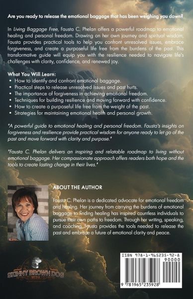 Expanded Amazon Book Blurb for "Living Baggage Free: Journey to Emotional Freedom and Healing" Are you carrying the weight of emotional baggage-those unresolved wounds, regrets, and past traumas that keep you from living your fullest life? It's time to set yourself free. In Living Baggage Free: Journey to Emotional Freedom and Healing, Fausta C. Phelan shares her powerful story of overcoming pain and finding peace, offering you the tools, insights, and encouragement you need to do the same. Through a blend of personal anecdotes, practical advice, and transformational exercises, this book will help you understand the invisible burdens that hold you back and guide you to release them for good. Whether you are struggling with family wounds, personal setbacks, or the stresses of daily life, this book provides a roadmap to rediscovering the joy, peace, and freedom you deserve.What You Will Learn:Uncover the Hidden Roots of Emotional Pain: Understand how past experiences shape your present and how to identify the baggage weighing you down. Let Go of Resentment and Guilt: Discover the power of forgiveness to heal wounds and unlock emotional freedom. Harness the Strength of Resilience: Build the tools you need to face life's challenges with courage and confidence. Find Inner Peace Through Self-Awareness: Learn to quiet the inner critic and embrace self-compassion. Create a Life of Meaning and Purpose: Replace fear and self-doubt with hope, intention, and direction. Who This Book Is For:Anyone tired of feeling stuck in cycles of regret, pain, or self-doubt. Readers seeking a compassionate and relatable guide to emotional healing. Individuals ready to embrace the transformative power of self-awareness and forgiveness. Those looking for actionable steps to cultivate resilience, peace, and joy in their lives. With heartfelt wisdom and actionable insights, Fausta invites you to embark on a journey to emotional freedom. Her gentle yet empowering approach will help you face your fears, heal your heart, and step into a life unburdened by the past.Why You'll Love This Book:Inspirational Storytelling: Fausta shares her personal journey of healing, making her guidance relatable and deeply moving. Practical Strategies: The book is filled with tools, exercises, and techniques you can apply to your own life right away. Empowering Message: Living Baggage Free is more than a book-it's a call to action to reclaim your joy and live the life you were meant to. It's time to lighten your load and take the first step toward lasting emotional freedom. Open this book and discover how to let go, heal, and embrace the beauty of a life lived fully.