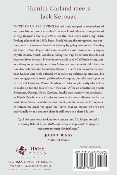 "Most of us are living behind time: trapped in some phase of our past like an insect in amber." So says Frank Mason, protagonist of Living Behind Time, a pre-9/11 on the road story with a big twist. Evoking echoes of the 1950s Beats, Frank Mason, the protagonist, reverses the standard east-west American journey by going west to east. Leaving his home in San Diego, California, he makes a solo cross-country trip to Myrtle Beach, South Carolina. Along the way, he revisits friends and locations from the past. He encounters a cult in the California desert, acts as a decoy to get immigrants into Arizona, connects with old friends in Boulder, Colorado and Columbia, Missouri. There's a serio-comic meetup near Kansas City with a friend who's taken up cultivating cannabis. He then reengages with an old girlfriend in Memphis, but reluctantly goes on to the Gulf Coast and Pensacola where an older couple nearly adopts him to make up for the loss of their own son. After an eventful stop with friends near Raleigh, North Carolina, Frank's cross-country trek concludes in Myrtle Beach, where he tries to process the recent discoveries he has made about himself and the nation's recent past. In the end, as he prepares to retrace his steps yet again, he learns that no matter who we are individually or as a country, there is still hope in a shared future.