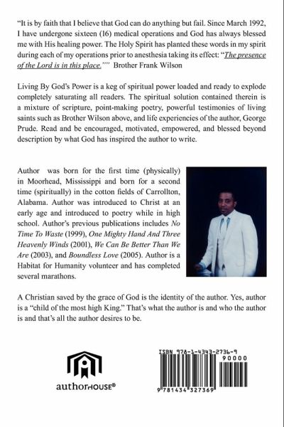 "It is by faith that I believe that God can do anything but fail. Since March 1992, I have undergone sixteen (16) medical operations and God has always blessed me with His healing power. The Holy Spirit has planted these words in my spirit during each of my operations prior to anesthesia taking its effect: "The presence of the Lord is in this place."" Brother Frank Wilson. Living By God's Power is a keg of spiritual power loaded and ready to explode completely saturating all readers. The spiritual solution contained therein is a mixture of scripture, point-making poetry, powerful testimonies of living saints such as Brother Wilson above, and life experiencies of the author, George Prude. Read and be encouraged, motivated, empowered , and blessed beyond description by what God has inspired the author to write.