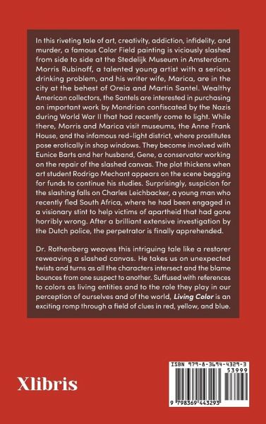 In this riveting tale of art, creativity, addiction, infidelity, and murder, a famous Color Field painting is viciously slashed from side to side at the Stedelijk Museum in Amsterdam. Morris Rubinoff, a talented young artist with a serious drinking problem, and his writer wife, Marica, are in the city at the behest of Oreia and Martin Santel. Wealthy American collectors, the Santels are interested in purchasing an important work by Mondrian that had been confiscated by the Nazis during World War II and recently come to light. While there, Morris and Marica visit museums, the Anne Frank House, and the infamous red-light district, where prostitutes pose erotically in shop windows. They become involved with Eunice Barts and her husband, Gene, a conservator working on the repair of the slashed canvas. The plot thickens when art student Rodrigo Mechant appears on the scene begging for funds to continue his studies. Surprisingly, suspicion for the slashing falls on Charles Leichbacker, a young man who recently fled South Africa, where he had been engaged in a visionary stint to help victims of apartheid that had gone horribly wrong. After a brilliant extensive investigation by the Dutch police, the perpetrator is finally apprehended. Dr. Rothenberg weaves this intriguing tale like a restorer reweaving a slashed canvas. He takes us on unexpected twists and turns as all the characters intersect with one another and the blame bounces from one suspect to another. Suff used with references to colors as living entities and to the role they play in our perception of ourselves and of the world, Living Color is an exciting romp through a field of clues in red, yellow, and blue.