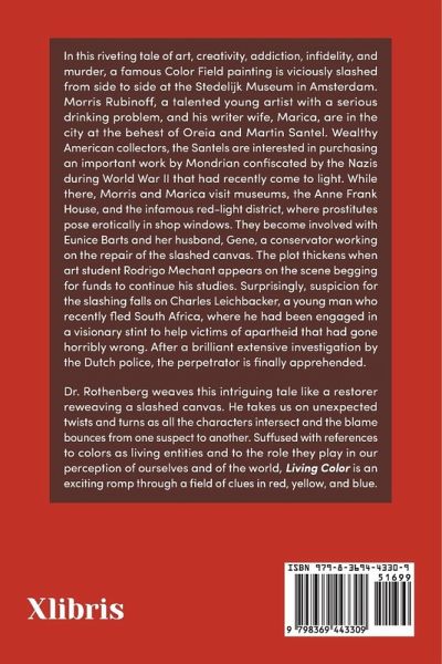 In this riveting tale of art, creativity, addiction, infidelity, and murder, a famous Color Field painting is viciously slashed from side to side at the Stedelijk Museum in Amsterdam. Morris Rubinoff, a talented young artist with a serious drinking problem, and his writer wife, Marica, are in the city at the behest of Oreia and Martin Santel. Wealthy American collectors, the Santels are interested in purchasing an important work by Mondrian that had been confiscated by the Nazis during World War II and recently come to light. While there, Morris and Marica visit museums, the Anne Frank House, and the infamous red-light district, where prostitutes pose erotically in shop windows. They become involved with Eunice Barts and her husband, Gene, a conservator working on the repair of the slashed canvas. The plot thickens when art student Rodrigo Mechant appears on the scene begging for funds to continue his studies. Surprisingly, suspicion for the slashing falls on Charles Leichbacker, a young man who recently fled South Africa, where he had been engaged in a visionary stint to help victims of apartheid that had gone horribly wrong. After a brilliant extensive investigation by the Dutch police, the perpetrator is finally apprehended. Dr. Rothenberg weaves this intriguing tale like a restorer reweaving a slashed canvas. He takes us on unexpected twists and turns as all the characters intersect with one another and the blame bounces from one suspect to another. Suff used with references to colors as living entities and to the role they play in our perception of ourselves and of the world, Living Color is an exciting romp through a field of clues in red, yellow, and blue.