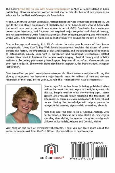 "Living Day To Day With Severe Osteoporosis" is a true story about living with the disease osteoporosis starting at the young age of 35, and becoming permanently disabled at 49. Severe osteoporosis is painful, debilitating, and can cause numerous fractures that may even require major surgery. Through my personal journey with this disease I discusses extensively in "Living Day To Day With Severe Osteoporosis" what osteoporosis is, how I was diagnosed, my treatment in fighting osteoporosis, and the changes it has made in my day-to-day living as a result. "Living Day To Day With Severe Osteoporosis" explains the causes of osteoporosis, risk factors, the importance of diet and exercise, and the relationship of hormones to osteoporosis. Equally important is prevention and treatment. Osteoporosis related injuries often result in fractures that require major surgery, physical therapy and mobility assistance. Becoming permanently handicapped happens all too often. Osteoporosis can even result in death. Since one in eight men have osteoporosis, this book includes a chapter just for men. Over ten million people currently have osteoporosis. Once known mostly for afflicting the elderly, osteoporosis has become a major health threat for millions of men and women regardless of their age. They can and do become victims. By the year 2020 half of all Americans will have osteoporosis. People need to know the warning signs. Many options are available today regarding the causes of osteoporosis and its treatment. There are even medications to help rebuild your bones. By reading "Living Day To Day With Severe Osteoporosis" you can educate yourself. Having the knowledge will help you recognize the warning signs. Please do not ignore them. You can do something about it if you take action soon enough. Do it for yourself and your family.