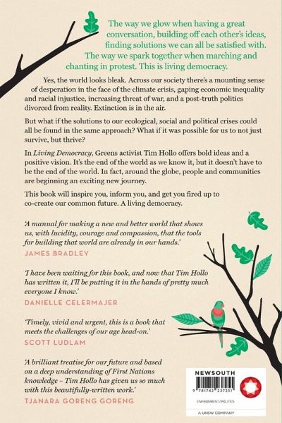 The way we glow when having a great conversation, building off each other's ideas, finding solutions we can all be satisfied with. The way we spark together when marching and chanting in protest. This is living democracy. Yes, the world looks bleak. Across our society there's a mounting sense of desperation in the face of the climate crisis, gaping economic inequality and racial injustice, increasing threat of war, and a post-truth politics divorced from reality. Extinction is in the air. But what if the solutions to our ecological, social and political crises could all be found in the same approach? What if it was possible for us to not just survive, but thrive? In Living Democracy, Greens activist Tim Hollo offers bold ideas and a positive vision. It's the end of the world as we know it, but it doesn't have to be the end of the world. In fact, around the globe, people and communities are beginning an exciting new journey. This book will inspire you, inform you, and get you fired up to co-create our common future. A living democracy. 'Everyone who reads this book is generously invited to get involved in the project of our times.' - David Ritter 'A brilliant conversation and action kick-starter from a man who walks the talk.'- Christine Milne 'It's pretty clear that the world we've known isn't working very well anymore; we need to reinvent it, and this book brims with good ideas about what that means!' - Bill McKibben 'A great vision for a bloodless coup of mutual aid and rule-governed anarchy.' - Tyson Yunkaporta 'A manual for making a new and better world that shows us, with lucidity, courage and compassion, that the tools for building that world are already in our hands.' - James Bradley 'I have been waiting for this book, and now that Tim Hollo has written it, I'll be putting it in the hands of pretty much everyone I know.' - Danielle Celermajer 'Timely, vivid and urgent, this is a book that meets the challenges of our age head-on.' - Scott Ludlam 'A brilliant treatise for our future and based on a deep understanding of First Nations knowledge - Tim Hollo has given us so much with this beautifully written work.' - Tjanara Goreng Goreng