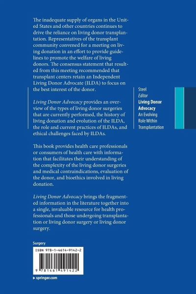 "This is a well written, thorough review of the role that independent living donor advocates (ILDAs) play in evaluating and counseling potential donors. ... The book is well written with interesting case studies. ... This will be a very useful resource in most transplant centers." (Anitha Vijaan, Doody's Book Reviews, March, 2014)