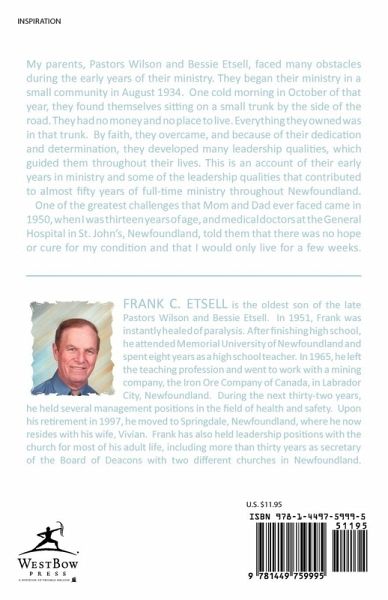 My parents, Pastors Wilson and Bessie Etsell, faced many obstacles during the early years of their ministry. They began their ministry in a small community in August 1934. One cold morning in October of that year, they found themselves sitting on a small trunk by the side of the road. They had no money and no place to live. Everything they owned was in that trunk. By faith, they overcame, and because of their dedication and determination, they developed many leadership qualities, which guided them throughout their lives. This is an account of their early years in ministry and some of the leadership qualities that contributed to almost fifty years of full-time ministry throughout Newfoundland. One of the greatest challenges that Mom and Dad ever faced came in 1950, when I was thirteen years of age, and medical doctors at the General Hospital in St. John's, Newfoundland, told them that there was no hope or cure for my condition and that I would only live for a few weeks.