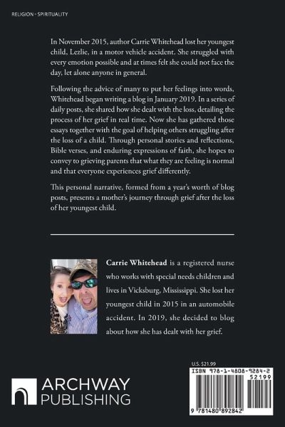 In November 2015, author Carrie Whitehead lost her youngest child, Lezlie, in a motor vehicle accident. She struggled with every emotion possible and at times felt she could not face the day, let alone anyone in general. Following the advice of many to put her feelings into words, Whitehead began writing a blog in January 2019. In a series of daily posts, she shared how she dealt with the loss, detailing the process of her grief in real time. Now she has gathered those essays together with the goal of helping others struggling after the loss of a child. Through personal stories and reflections, Bible verses, and enduring expressions of faith, she hopes to convey to grieving parents that what they are feeling is normal and that everyone experiences grief differently. This personal narrative, formed from a year's worth of blog posts, presents a mother's journey through grief after the loss of her youngest child.