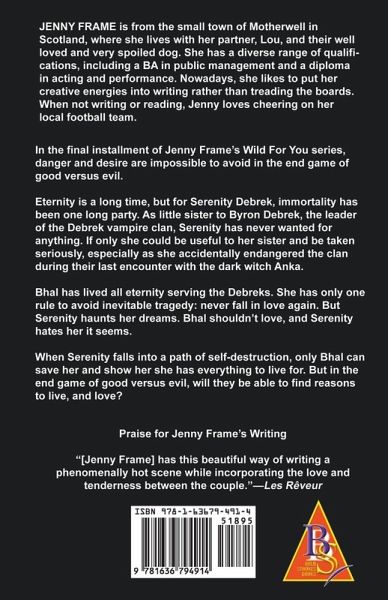 In the final installment of Jenny Frame's Wild For You series, danger and desire are impossible to avoid in the end game of good versus evil. Eternity is a long time, but for Serenity Debrek, immortality has been one long party. As little sister to Byron Debrek, the leader of the Debrek vampire clan, Serenity has never wanted for anything. If only she could be useful to her sister and be taken seriously, especially as she accidentally endangered the clan during their last encounter with the dark witch Anka. Bhal has lived all eternity serving the Debreks. She has only one rule to avoid inevitable tragedy: never fall in love again. But Serenity haunts her dreams. Bhal shouldn't love, and Serenity hates her it seems. When Serenity falls into a path of self-destruction, only Bhal can save her and show her she has everything to live for. But in the end game of good versus evil, will they be able to find reasons to live, and love?