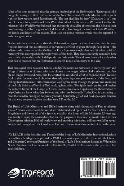 It has often been expressed that the primary leadership of the Reformation [Restoration] did not go far enough in their restoration of the New Testament Church. Martin Luther got it right on how we are saved [justification]. "The just shall live by faith" (Galatians 3:11), was one of the revelatory truths of God's Word that rallied the Reformers. We praise God for the reformer John Wycliffe who believed that the people should be able to read the Bible in their own language; and by the grace of God, he worked hard to get the truth of God's Word into the hands and hearts of the masses. That is an on-going mission which must be repeated in each new generation. Notice, within a half century after the Reformation began the church was in crisis, because it misunderstood that justification or salvation is of God by grace through faith alone - the believers who came out of the Medieval or Dark Ages were taught that sanctification [spiritual maturity] was accomplished through works of the flesh. They were constantly reminded how much their relationship with God depended on their works. The sad news is many local churches continue to practice this pre-Reformation church model of ministry to this day. That theological error has come full circle today. The results are witnessed in every city, town and village of America as citizens, who have chosen to no longer believe God is relevant, but that He no longer loves and cares, that He created the world and left it to feign for itself (Deism). Add to that the many local churches that rely upon legalism, performance of the flesh, and feelings (entertainment), rather than upon God's grace alone through the power and anointing of the Holy Spirit and Word of God working in tandem. The Spirit leads, guides, and teaches the restored truths of the Gospel of Grace. Teachers were raised up during the Reformation to help Christians know what they believed and why they believed it. Today, God is continuing to meet that need by raising up desperately needed Spiritually-gifted and bold apologetic teachers for that very purpose in these last days (see 2 Timothy 2:2). The Bread of Life Ministries and Bible Institute along with thousands of Para ministries across America and around the world are established and Spirit-led for "such a time as this." Magdalene and I were led of the Spirit to establish the Bread of Life Ministries 25 years ago specifically to equip the saints (disciples) for that purpose. If the churches would return to their Christ-given mission, biblical world view and teaching ministries, millions would be saved, disciple and brought into the kingdom of God with the continued commitment to do the same!
