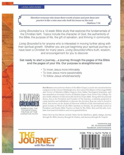 Living Grounded is a 12-week Bible study that explores the fundamentals of the Christian faith. Topics include the character of God, the authenticity of the Bible, the purpose of life, the gift of salvation, and thriving in community. Living Grounded is for anyone who is interested in moving further along with their spiritual growth. Whether you are just beginning your spiritual journey or have been a Christian for many years, Living Grounded offers truth, wisdom, and encouragement for you to discover. Get ready to start a journey...a journey through the pages of the Bible and the pages of your life. Our purpose is straightforward: ¿ To know Jesus more intimately ¿ To love Jesus more passionately ¿ To follow Jesus wholeheartedly