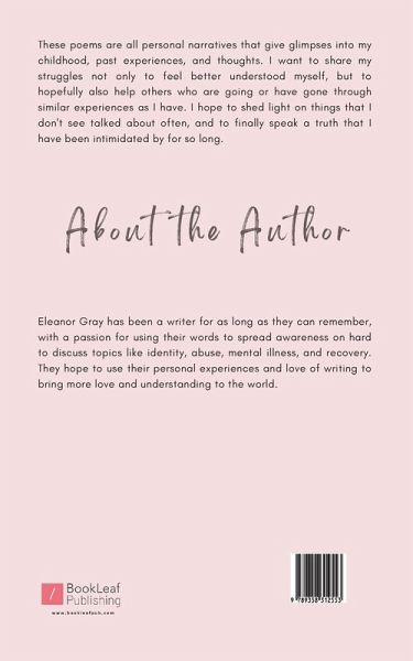 These poems are all personal narratives that give glimpses into my childhood, past experiences, and thoughts. I want to share my struggles not only to feel better understood myself, but to hopefully also help others who are going or have gone through similar experiences as I have. I hope to shed light on things that I don't see talked about often, and to finally speak a truth that I have been intimidated by for so long.