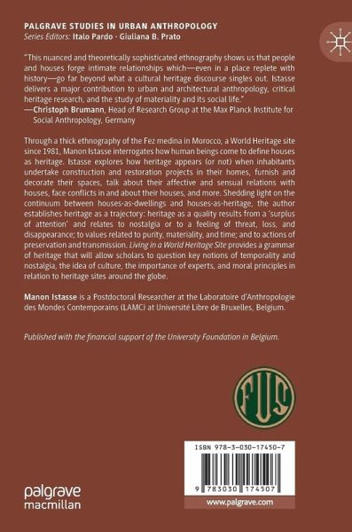 Through a thick ethnography of the Fez medina in Morocco, a World Heritage site since 1981, Manon Istasse interrogates how human beings come to define houses as heritage. Istasse interrogates how heritage appears (or not) when inhabitants undertake construction and restoration projects in their homes, furnish and decorate their spaces, talk about their affective and sensual relations with houses, face conflicts in and about their houses, and more. Shedding light on the continuum between houses-as-dwellings and houses-as-heritage, the author establishes heritage as a trajectory: heritage as a quality results from a 'surplus of attention' and relates to nostalgia or to a feeling of threat, loss, and disappearance; to values related to purity, materiality, and time; and to actions of preservation and transmission. Living in a World Heritage site provides a grammar of heritage that will allow scholars to question key notions of temporality and nostalgia, the idea of culture, theimportance of experts, and moral principles in relation to heritage sites around the globe.