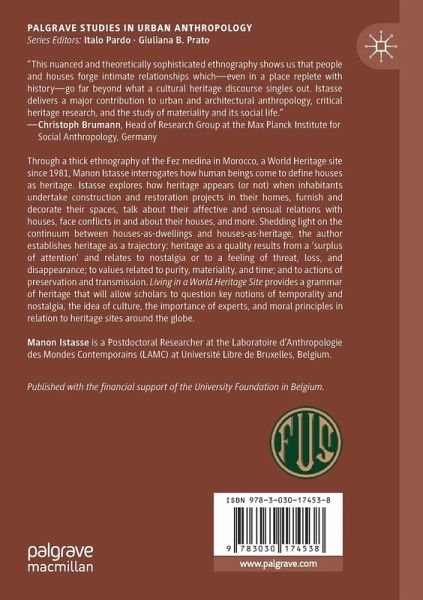Through a thick ethnography of the Fez medina in Morocco, a World Heritage site since 1981, Manon Istasse interrogates how human beings come to define houses as heritage. Istasse interrogates how heritage appears (or not) when inhabitants undertake construction and restoration projects in their homes, furnish and decorate their spaces, talk about their affective and sensual relations with houses, face conflicts in and about their houses, and more. Shedding light on the continuum between houses-as-dwellings and houses-as-heritage, the author establishes heritage as a trajectory: heritage as a quality results from a 'surplus of attention' and relates to nostalgia or to a feeling of threat, loss, and disappearance; to values related to purity, materiality, and time; and to actions of preservation and transmission. Living in a World Heritage site provides a grammar of heritage that will allow scholars to question key notions of temporality and nostalgia, the idea of culture, theimportance of experts, and moral principles in relation to heritage sites around the globe.