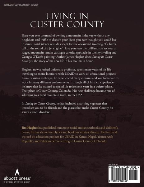 Have you ever dreamed of owning a mountain hideaway without any neighbors and traffic to disturb you? Have you ever thought you could live in almost total silence outside except for the occasional tweeting of a bird's call or the sound of a jet engine? Have you seen the brilliant sun set over a rugged mountain terrain casting a colorful spectacle in the sky rivaling any Georgia O'Keefe painting? Author James Hughes does; Living in Custer County is the story of his new life in his mountain home. Hughes, now a retired university professor, spent many years of his life travelling to exotic locations with USAID to work on educational projects. From Pakistan to Kenya, he experienced many cultures and was fortunate to work in many different environments. Through all of his rich experiences, he knew that he wanted to spend his retirement years in a quieter place. That place is Custer County, Colorado. His new challenge became one of adjusting to a rural mountain town, in the USA. In Living in Custer County, he has included charming vignettes that introduce you to his friends and the places that make Custer County his senior citizen dividend.