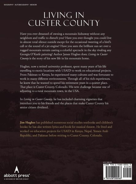 Have you ever dreamed of owning a mountain hideaway without any neighbors and traffic to disturb you? Have you ever thought you could live in almost total silence outside except for the occasional tweeting of a bird's call or the sound of a jet engine? Have you seen the brilliant sun set over a rugged mountain terrain casting a colorful spectacle in the sky rivaling any Georgia O'Keefe painting? Author James Hughes does; Living in Custer County is the story of his new life in his mountain home. Hughes, now a retired university professor, spent many years of his life travelling to exotic locations with USAID to work on educational projects. From Pakistan to Kenya, he experienced many cultures and was fortunate to work in many different environments. Through all of his rich experiences, he knew that he wanted to spend his retirement years in a quieter place. That place is Custer County, Colorado. His new challenge became one of adjusting to a rural mountain town, in the USA. In Living in Custer County, he has included charming vignettes that introduce you to his friends and the places that make Custer County his senior citizen dividend.