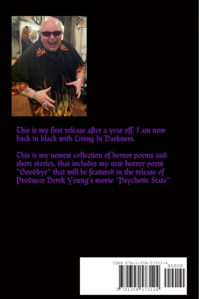 This is my first release after a year off, now I am back in black with, Living In Darkness. Includes new horror poems and short stories, also "Goodbye" my horror poem to be featured in Producer Derek Young's movie "Psychotic State"