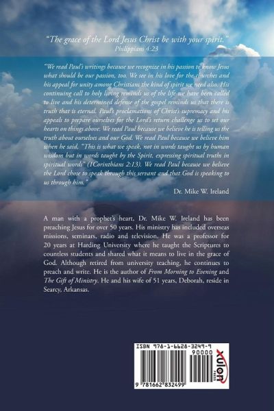 "The grace of the Lord Jesus Christ be with your spirit." Philippians 4:23 "We read Paul's writings because we recognize in his passion to know Jesus what should be our passion, too. We see in his love for the churches and his appeal for unity among Christians the kind of spirit we need also. His continuing call to holy living reminds us of the life we have been called to live and his determined defense of the gospel reminds us that there is truth that is eternal. Paul's proclamations of Christ's supremacy and his appeals to prepare ourselves for the Lord's return challenge us to set our hearts on things above. We read Paul because we believe he is telling us the truth about ourselves and our God. We read Paul because we believe him when he said, "This is what we speak, not in words taught us by human wisdom but in words taught by the Spirit, expressing spiritual truths in spiritual words" (1Corinthians 2:13). We read Paul because we believe the Lord chose to speak through this servant and that God is speaking to us through him." Dr. Mike W. Ireland A man with a prophet's heart, Dr. Mike W. Ireland has been preaching Jesus for over 50 years. His ministry has included overseas missions, seminars, radio and television. He was a professor for 20 years at Harding University where he taught the Scriptures to countless students and shared what it means to live in the grace of God. Although retired from university teaching, he continues to preach and write. He is the author of From Morning to Evening and The Gift of Ministry. He and his wife of 51 years, Deborah, reside in Searcy, Arkansas.