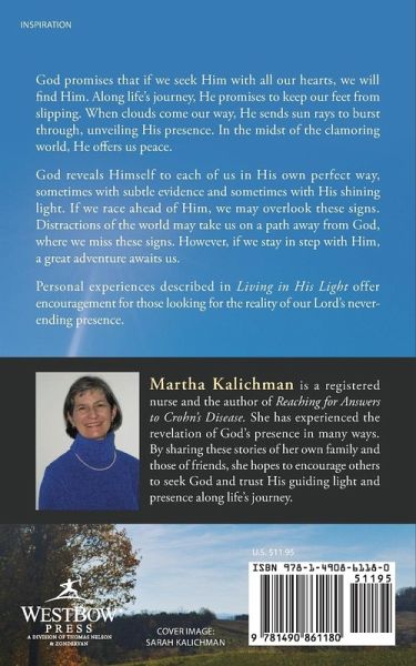 God promises that if we seek Him with all our hearts, we will find Him. Along life's journey, He promises to keep our feet from slipping. When clouds come our way, He sends sun rays to burst through, unveiling His presence. In the midst of the clamoring world, He offers us peace. God reveals Himself to each of us in His own perfect way, sometimes with subtle evidence and sometimes with His shining light. If we race ahead of Him, we may overlook these signs. Distractions of the world may take us on a path away from God, where we miss these signs. However, if we stay in step with Him, a great adventure awaits us. Personal experiences described in Living in His Light offer encouragement for those looking for the reality of our Lord's never-ending presence.