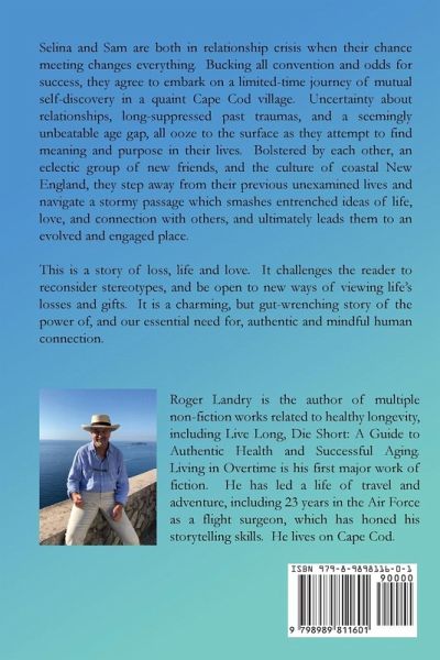 Selina and Sam are both in relationship crisis when their chance meeting changes everything. Bucking all convention and odds for success, they agree to embark on a limited-time journey of mutual self-discovery in a quaint Cape Cod village. Uncertainty about relationships, long-suppressed past traumas, and a seemingly unbeatable age gap, all ooze to the surface as they attempt to find meaning and purpose in their lives. Bolstered by each other, an eclectic group of new friends, and the culture of coastal New England, they step away from their previous unexamined lives and navigate a stormy passage which smashes entrenched ideas of life, love, and connection with others, and ultimately leads them to an evolved and engaged place. This is a story of loss, life and love. It challenges the reader to reconsider stereotypes, and be open to new ways of viewing life's losses and gifts. It is a charming, but gut-wrenching story of the power of, and our essential need for, authentic and mindful human connection.