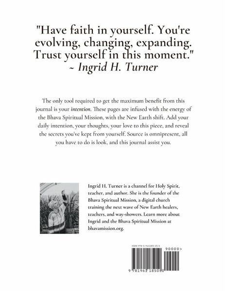 "Have faith in yourself. You're evolving, changing, expanding. Trust yourself in this moment." ~ Ingrid H. Turner ¿The only tool required to get the maximum benefit from this journal is your intention. These pages are infused with the energy of the Bhava Spiritual Mission, with the New Earth shift. Add your daily intention, your thoughts, your love to this piece, and reveal the secrets you've kept from yourself. Source is omnipresent, all you have to do is look, and this journal assist you.