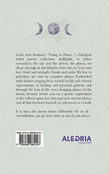 Leisly Ann Roman's Living in Phases, a bilingual debut poetry collection, highlights, or rather normalizes, the ups and the downs, the phases, we all go through in this lifetime. Pain and joy. Love and loss. Grief and strength. Doubt and pride. We live in polarities, we exist in countless phases. Embedded with themes ranging from mental health and cultural expectations, to healing and personal growth, and through the lens of the ever-changing phases of the moon, Roman invites you on a poetic exploration as she reflects upon her own past and current phases, and all that has been learned, or unlearned, as a result.…mehr