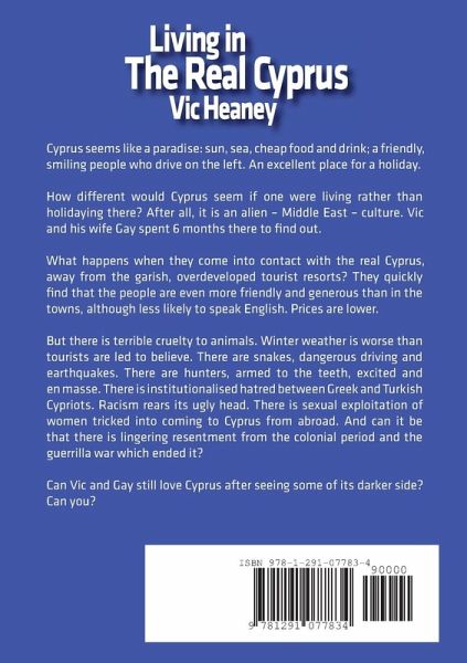 Cyprus ticks all the boxes. Sun. Sea. Cheap food and drink. Friendly, smiling people. How would you like to live there? Is this island heaven too good to be true? Surely there can be no darker side? Is there no lingering resentment from the colonial period and the bitter and vicious guerrilla war which ended it? What happens when Vic and his wife Gay come into contact with the real Cyprus, away from the garish, overdeveloped tourist resorts? They quickly find people even more friendly and generous than in the towns, although less likely to speak English. But they also discover terrible cruelty to animals; winter weather worse than tourists are led to believe; snakes, dangerous driving and earthquakes; hunters, armed to the teeth, excited and trigger happy; institutionalised hatred between Greek and Turkish Cypriots; racism and sexual exploitation of women tricked into coming to Cyprus from abroad. Is paradise lost?