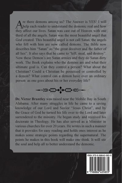 Are there demons among us? The Answer is YES! I will help each reader to understand the demonic real and how they affect our lives. Satan was cast out of Heaven with one third of all the angels. Satan was the most beautiful angel that God created. This beautiful angel is not call Satan, the angels who fell with him are now called demons. The Bible now describes him "Satan" as "the great deceiver and the father of all lies". It also says that he came to "kill, steal, and destroy". Now these Demon's are Satan armies and they do Satan dirty work. The Book explains who the demons are and what their ultimate goal is. Can they control a person? What about the Christian? Could a Christian be possessed or controlled by a demon? What control can a demon have over an ordinary person as one goes about his or her everyday life?