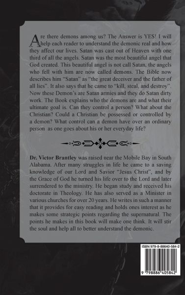 Are there demons among us? The Answer is YES! I will help each reader to understand the demonic real and how they affect our lives. Satan was cast out of Heaven with one third of all the angels. Satan was the most beautiful angel that God created. This beautiful angel is not call Satan, the angels who fell with him are now called demons. The Bible now describes him "Satan" as "the great deceiver and the father of all lies". It also says that he came to "kill, steal, and destroy". Now these Demon's are Satan armies and they do Satan dirty work. The Book explains who the demons are and what their ultimate goal is. Can they control a person? What about the Christian? Could a Christian be possessed or controlled by a demon? What control can a demon have over an ordinary person as one goes about his or her everyday life?