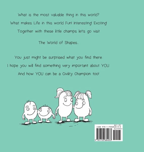 What is the most valuable thing in this world? What makes Life in this world Fun! Interesting! Exciting! Together with these little champs let’s go visit The World of Shapes. This is a unique place, where you will ¿nd the country of Triangle ¿lled with green apple A’s, and the country of Square ¿lled with beautiful blue B’s. You will see the country of Circle ¿lled with cherry red C’s, and the country of Rectangle ¿lled with dark brown D’s. All is calm and all is great…until one morning, a beautiful blue B wakes up and sees how boring it is to be all alike. Together, A, B, C and D discover the joys of connecting in life and valuing their di¿erences. You just might be surprised what you ¿nd there. I hope you will ¿nd something very important about YOU. And how YOU can be a Civility Champion too! This is a story for children of all ages which illustrates just what civility is--treating others with respect and kindness. Just as each letter of the alphabet is needed and important in the world of communication, every person has a valuable gift to offer in this world. So instead of being critical or afraid of differences with others, we can choose to value our differences. By sharing our knowledge and personalities, our gifts and talents, we can work together more effectively. We can have more fun together. We will create a more complete and beautiful picture of Life together. That's how we make this world a better place!