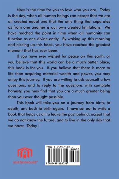Now is the time for you to love who you are. Today is the day, when all human beings can accept that we are all created equal and that the only thing that separates us from one another is our own created limitations. We have reached the point in time when all humanity can function as one divine entity. By waking up this morning and picking up this book, you have reached the greatest moment that has ever been. If you have ever wished for peace on this earth, or you believe that this world can be a much better place, this book is for you. If you believe that there is more to life than acquiring material wealth and power, you may enjoy this journey. If you are willing to ask yourself a few questions, and to reply to the questions with complete honesty, you may find that you are a much greater being than you ever thought possible. This book will take you on a journey from birth, to death, and back to birth again. I have set out to write a book that helps us all to leave the past behind, accept that we do not know the future, and to live in the only day that we have: Today !