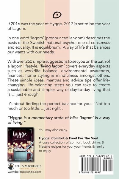 Living Lagom 250 + simple steps to a balanced, happier & more sustainable life If 2016 was the year of hygge. 2017 is set to be the year of lagom. In one word ‘lagom’ (pronounced lar-gom) describes the basis of the Swedish national psyche; one of consensus and equality. It is equilibrium. A way of life that balances our wants with our needs. With over 250 simple suggestions to set you on the path of a lagom lifestyle, ‘living lagom’ covers everyday aspects such as work/life balance, environmental awareness, finances, home styling & mindfulness amongst others. These simple ideas, mantras and advice tips offer life-changing, life-balancing steps you can take to create a sustainable and simpler way of day-to-day living that is…..just enough. It’s about finding the perfect balance for you. ‘Not too much or too little….just right’. "Hygge is a momentary state of bliss ‘Lagom’ is a way of living"