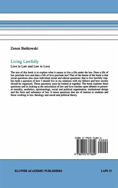 The aim of this book is to explore what it means to live a life under the law. Does a life of law preclude love and does a life of love preclude law? Part of the theme of the book is that social questions also raise individual moral and ethical questions; that to live lawfully implies both a question of how I should live in my relations with my fellows and how society should be organised. These questions must be looked at together. The book explores these questions and in looking at the articulation of law and love touches upon debates in personal morality, aesthetics, epistemology, social and political organisation, institutional design and the form and substance of law. It raises questions that are of interest to students and those working in law, theology, and social and political theory.