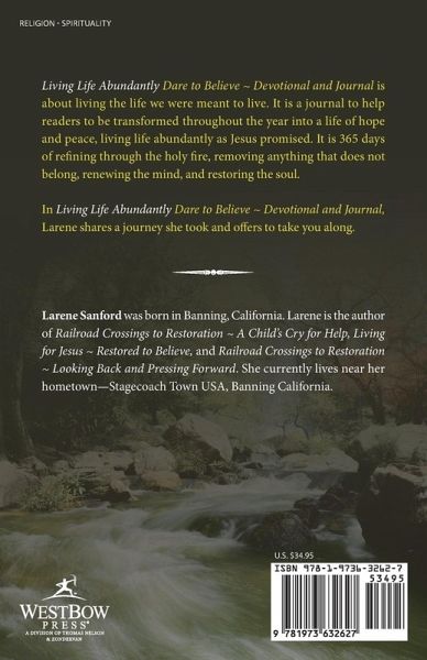 Living Life Abundantly Dare to Believe ~ Devotional and Journal is about living the life we were meant to live. It is a journal to help readers to be transformed throughout the year into a life of hope and peace, living life abundantly as Jesus promised. It is 365 days of refining through the holy fire, removing anything that does not belong, renewing the mind, and restoring the soul. In Living Life Abundantly Dare to Believe ~ Devotional and Journal, Larene shares a journey she took and offers to take you along.