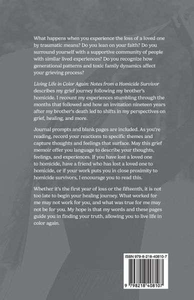 What happens when you experience the loss of a loved one by traumatic means? Do you lean on your faith? Do you surround yourself with a supportive community of people with similar lived experiences? Do you recognize how generational patterns and toxic family dynamics affect your grieving process? Living Life in Color Again: Notes from a Homicide Survivor describes my grief journey following my brother's homicide. I recount my experiences stumbling through the months that followed and how an invitation nineteen years after my brother's death led to shifts in my perspectives on grief, healing, and more. Journal prompts and blank pages are included. As you're reading, record your reactions to specific themes and capture thoughts and feelings that surface. May this grief memoir offer you language to describe your thoughts, feelings, and experiences. If you have lost a loved one to homicide, have a friend who has lost a loved one to homicide, or if your work puts you in close proximity to homicide survivors, I encourage you to read this. Whether it's the first year of loss or the fifteenth, it is not too late to begin your healing journey. What worked for me may not work for you, and what was true for me may not be for you. My hope is that my words and these pages guide you in finding your truth, allowing you to live life in color again.