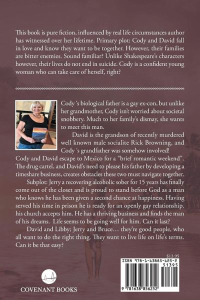 This book is pure fiction, influenced by real life circumstances author has witnessed over her lifetime. Primary plot: Cody and David fall in love and know they want to be together. However, their families are bitter enemies. Sound familiar? Unlike Shakespeare's characters however, their lives do not end in suicide. Cody is a confident young woman who can take care of herself, right? Cody 's biological father is a gay ex-con, but unlike her grandmother, Cody isn't worried about societal snobbery. Much to her family's dismay, she wants to meet this man. David is the grandson of recently murdered well known male socialite Rick Browning, and Cody 's grandfather was somehow involved! Cody and David escape to Mexico for a "brief romantic weekend. "The drug cartel, and David's need to please his father by developing a timeshare business, creates obstacles these two must navigate together. Subplot: Jerry a recovering alcoholic sober for 15 years has finally come out of the closet and is proud to stand before God as a man who knows he has been given a second chance at happiness. Having served his time in prison he is ready for an openly gay relationship. His church excepts him. He has a thriving business and finds the man of his dreams. Life seems to be going well for him. Can it last? David and Libby; Jerry and Bruce... they're good people, who all want to do the right thing. They want to live life on life's terms. Can it be that easy?