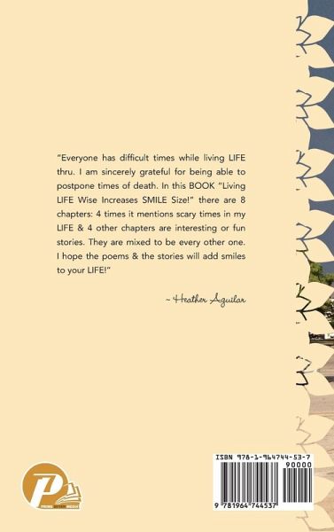 "Everyone has difficult times while living LIFE thru. I am sincerely grateful for being able to postpone times of death. In this BOOK "Living LIFE Wise Increases SMILE Size!" There are 8 chapters: 4 times it mentions scary times in my LIFE & 4 other chapters are interesting or fun stories. They are mixed to be every other one. I hope the poems & the stories will add smiles to your LIFE!" ~ Heather Aguilar