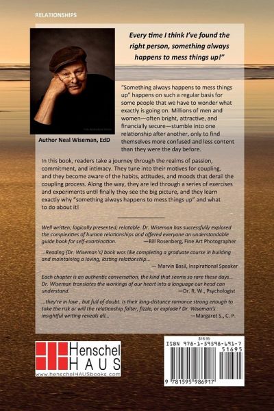 "Every time I think I've found the right person, something always happens to mess things up!" "Something always happens to mess things up" happens on such a regular basis for some people that we have to wonder what exactly is going on. Millions of men and women-often bright, attractive, and financially secure-stumble into one relationship after another, only to find themselves more confused and less content than they were the day before. In this book, readers take a journey through the realms of passion, commitment, and intimacy. They tune into their motives for coupling, and they become aware of the habits, attitudes, and moods that derail the coupling process. Along the way, they are led through a series of exercises and experiments until finally they see the big picture, and they learn exactly why "something always happens to mess things up" and what to do about it!