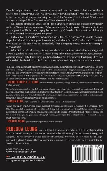 Does it really matter who one chooses to marry and how one makes a choice as to who to marry, or is it basically true that "you always marry the wrong person"? Was Jane Austen right in her portrayals of couples marrying for "love," for "comfort," or for both? What about arranged marriages? Does "the one" exist? How about soulmates? Will getting involved in casual sex or "hook-up culture" affect one's chances of eventually realizing "happy lifelong monogamy"? Are promoters of "purity culture" basically right that their approach will help lead to happy, lasting marriages? Can there be a way forward through the culture wars? Are dating apps any good? Virtue ethics is sometimes drawn upon for a dependable approach to couple relationships. But what does this approach consist of, and which "virtues" (as there are potentially very many) should one focus on, particularly when navigating dating culture in contemporary contexts? What light might theology, history, and the human sciences (including sociology and psychology) shed on these matters? Rebecca Leong offers findings from wide-ranging interdisciplinary studies that address these questions (and more), in the process developing a five-fold ethic and further building blocks for better approaches to dating in contemporary contexts.