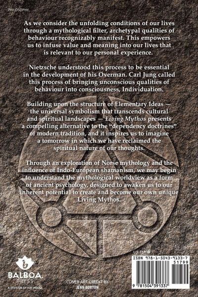 As we consider the unfolding conditions of our lives through a mythological filter, archetypal qualities of behavior recognizably manifest. This empowers us to infuse value and meaning into our lives that are relevant to our personal experience. Nietzsche understood this process to be essential in the development of his Overman. Carl Jung called this process of bringing unconscious qualities of behavior into consciousness, individuation. Building on the structure of elementary ideas—the universal symbolism that transcends cultural and spiritual landscapes—Living Mythos presents a compelling alternative to the "dependency doctrines" of modern tradition, and it inspires us to imagine a tomorrow in which we have reclaimed the spiritual nature of our thoughts. Through an exploration of Norse mythology and the influence of Indo-European shamanism, we may begin to understand the mythological worldview as a form of ancient psychology, designed to awaken us to our inherent potential to create and become our own unique living mythos.