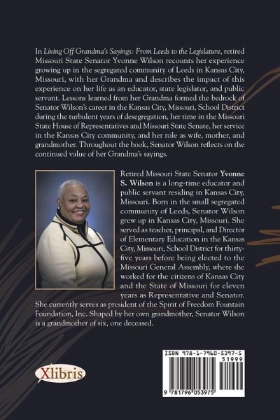 In Living Off Grandma's Sayings: From Leeds to the Legislature, retired Missouri State Senator Yvonne Wilson recounts her experience growing up in the segregated community of Leeds in Kansas City, Missouri, with her Grandma and describes the impact of this experience on her life as an educator, state legislator, and public servant. Lessons learned from her Grandma formed the bedrock of Senator Wilson's career in the Kansas City, Missouri, School District during the turbulent years of desegregation, her time in the Missouri House of Representatives and Missouri State Senate, her service in the Kansas City community, and her role as wife, mother, and grandmother. Throughout the book, Senator Wilson reflects on the continued value of her Grandma's sayings.