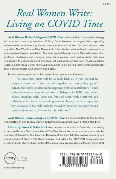 Moments of life captured in an unprecedented global pandemic Real Women Write: Living on COVID Time is Volume 19 of prose and poetry by members of Story Circle Network. The 52 authors of the 80 pieces in this collection wrote about their lives, engaging with experiences and emotions uniquely their own, in response to the spread of COVID-19 through a year filled with many other profound challenges and changes. Together they form a small chapter in a humanity-sized story. Brooke Warner says in her Foreword, "To remember 2020 will be to look back on a year marked by complexity-so much loss swirled together with surprising gains." Indeed, that swirl is evident in the responses of these contributors. "Their stories showcase a range of reactions to living on COVID time, which include grappling with illness and fear and death, with heartbreak and isolation, with the coexistence of ugliness and beauty. In these pages, you may see yourself. You will surely be moved by the many perspectives and considerations and experiences in this collection." Real Women Write: Living on COVID Time is a strong addition to the literature and herstory of 21st century women enduring and evolving through a remarkable time.