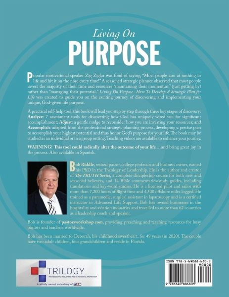 Popular motivational speaker Zig Ziglar was fond of saying, "Most people aim at nothing in life and hit it on the nose every time!" A seasoned strategic planner observed that most people invest the majority of their time and resources "maintaining their momentum" (just getting by) rather than "managing their potential." Living On Purpose - How To Develop A Strategic Plan for Life was created to guide you on the exciting journey of discovering and implementing your unique, God-given life purpose. A practical self-help tool, this book will lead you step by step through three key stages of discovery: Analyze: 7 assessment tools for discovering how God has uniquely wired you for significant accomplishment; Adjust: a gentle nudge to reconsider how you are investing your resources; and Accomplish: adapted from the professional strategic planning process, developing a precise plan to accomplish your highest potential and thus honor God's purpose for your life.The book may be studied as an individual or in a group setting.Teaching videos are available to enhance your journey. WARNING! This tool could radically alter the outcome of your life...and bring great joy in the process. Also available in Spanish.