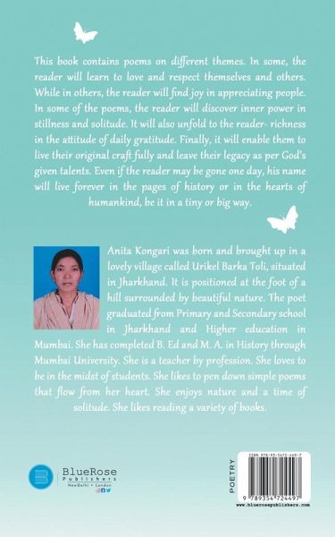 The book contains poems on different themes. In some, the reader will learn to love and respect themselves and others. While in others, the reader will find joy in appreciating people. In some of the poems, the reader will discover inner power in stillness and solitude. It will also unfold to the reader- richness in the attitude of daily gratitude. Finally, it will enable them to live their original craft fully and leave their legacy as per God's given talents. Even if the reader may be gone one day his name will live forever in the pages of history or in the hearts of humankind, be it in a tiny or big way.
