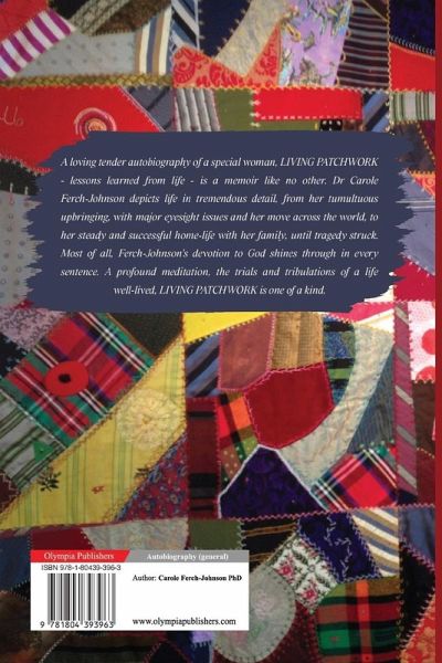 A loving tender autobiography of a special woman, LIVING PATCHWORK - lessons learned from life - is a memoir like no other. Dr Carole Ferch-Johnson depicts life in tremendous detail, from her tumultuous upbringing, with major eyesight issues and her move across the world, to her steady and successful home-life with her family, until tragedy struck. Most of all, Ferch-Johnson's devotion to God shines through in every sentence. A profound meditation, the trials and tribulations of a life well-lived, LIVING PATCHWORK is one of a kind.