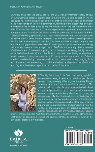 Living Proof is a real, insightful, honest, and yet, strongly informative story of how a young woman's personal experiences through the U.S. public education system equipped her with the knowledge and tools that would unknowingly lead her later in life to recognize an issue of discrimination, resulting in the dissonance between the disabled and general populations. Where it has now lead her to embark on the road of sharing her story with YOU by writing this book to promote more awareness in regard to the lack of inclusiveness. From an early age, as she dealt with her "physical" disability, specifically visual impairment, she always had to adapt to each new situation as it came. For the most part, she remained to keep herself optimistic and live her life as ordinarily as possible. This book provides an original module that teaches and suggests how one can begin to bridge the gap, at any time, in reaching inclusiveness. It centers on the importance of self-advocacy through the importance of self-awareness. Foreseen as anything but ordinary to most, Living Proof gives way for individuals with and without disabilities to see how one's life is just as ordinary as another even if it may not seem like it. Currently as an entrepreneur, Ms. Cabrera is a dedicated disability consultant and life coach, compassionately bringing forth techniques and understanding to both the disabled and general populations in reaching inclusiveness on a personal and professional level.