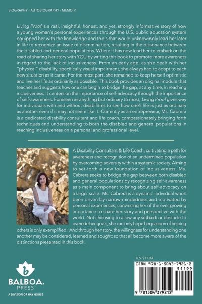 Living Proof is a real, insightful, honest, and yet, strongly informative story of how a young woman’s personal experiences through the U.S. public education system equipped her with the knowledge and tools that would unknowingly lead her later in life to recognize an issue of discrimination, resulting in the dissonance between the disabled and general populations. Where it has now lead her to embark on the road of sharing her story with YOU by writing this book to promote more awareness in regard to the lack of inclusiveness. From an early age, as she dealt with her "physical" disability, specifically visual impairment, she always had to adapt to each new situation as it came. For the most part, she remained to keep herself optimistic and live her life as ordinarily as possible. This book provides an original module that teaches and suggests how one can begin to bridge the gap, at any time, in reaching inclusiveness. It centers on the importance of self-advocacy through the importance of self-awareness. Foreseen as anything but ordinary to most, Living Proof gives way for individuals with and without disabilities to see how one’s life is just as ordinary as another even if it may not seem like it. Currently as an entrepreneur, Ms. Cabrera is a dedicated disability consultant and life coach, compassionately bringing forth techniques and understanding to both the disabled and general populations in reaching inclusiveness on a personal and professional level.