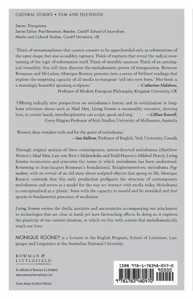 Through original analysis of three digital-age, auteur-directed melodramas (Matthew Weiner’s Mad Men, Lars von Trier’s Melancholia and Todd Haynes’s Mildred Pierce), Living Screens explores the "plasticity" of our current situation in which we live with screens that melodramatically touch our lives.