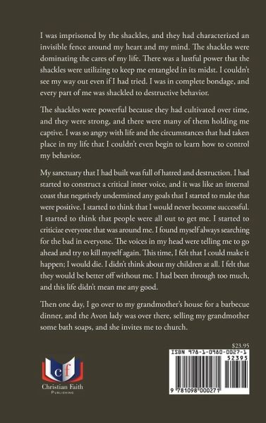 I was imprisoned by the shackles, and they had characterized an invisible fence around my heart and my mind. The shackles were dominating the cares of my life. There was a lustful power that the shackles were utilizing to keep me entangled in its midst. I couldn't see my way out even if I had tried. I was in complete bondage, and every part of me was shackled to destructive behavior. The shackles were powerful because they had cultivated over time, and they were strong, and there were many of them holding me captive. I was so angry with life and the circumstances that had taken place in my life that I couldn't even begin to learn how to control my behavior. My sanctuary that I had built was full of hatred and destruction. I had started to construct a critical inner voice, and it was like an internal coast that negatively undermined any goals that I started to make that were positive. I started to think that I would never become successful. I started to think that people were all out to get me. I started to criticize everyone that was around me. I found myself always searching for the bad in everyone. The voices in my head were telling me to go ahead and try to kill myself again. This time, I felt that I could make it happen; I would die. I didn't think about my children at all. I felt that they would be better off without me. I had been through too much, and this life didn't mean me any good. Then one day, I go over to my grandmother's house for a barbecue dinner, and the Avon lady was over there, selling my grandmother some bath soaps, and she invites me to church.