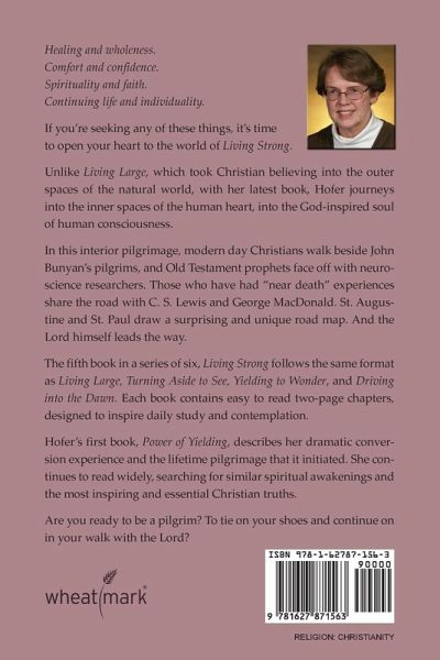 Healing and wholeness. Comfort and confidence. Spirituality and faith. Continuing life and individuality. If you're seeking any of these things, it's time to open your heart to the world of Living Strong. Unlike Living Large, which took Christian believing into the outer spaces of the natural world, with her latest book, Patricia Hofer journeys into the inner spaces of the human heart, into the God-inspired soul of human consciousness. In this interior pilgrimage, modern day Christians walk beside John Bunyan's pilgrims, and Old Testament prophets face off with neuroscience researchers. Those who have had "near death" experiences share the road with C. S. Lewis and George MacDonald. St. Augustine and St. Paul draw a surprising and unique road map. And the Lord himself leads the way. The fifth book in a series of six, Living Strong follows the same format as Living Large, Turning Aside to See, Yielding to Wonder, and Driving into the Dawn. Each book contains easy to read two-page chapters, designed to inspire daily study and contemplation. Hofer's first book, Power of Yielding, describes her dramatic conversion experience and the lifetime pilgrimage that it initiated. She continues to read widely, searching for similar spiritual awakenings and the most inspiring and essential Christian truths. Are you ready to be a pilgrim? To tie on your shoes and continue on in your walk with the Lord?